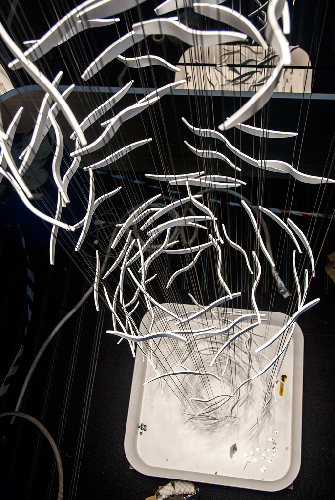 La plus grande difficulté de l’installation de l’oeuvre est de respecter le mouvement. Nous avons dû effectuer plusieurs rectifications et modifier le centre à la base pour avoir une lecture harmonieuse du tourbillon.